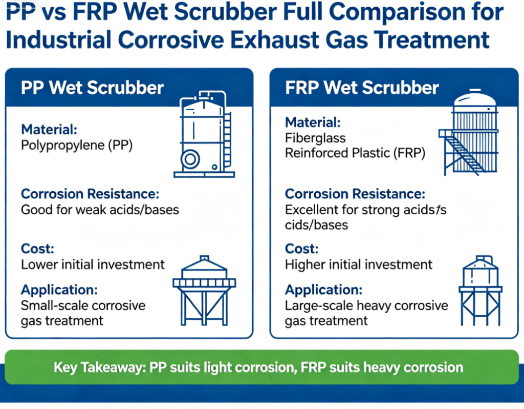 The PP vs FRP wet scrubber selection is the most critical material decision for industrial exhaust gas treatment system design, directly impacting treatment efficiency, regulatory compliance, and long-term operational reliability.