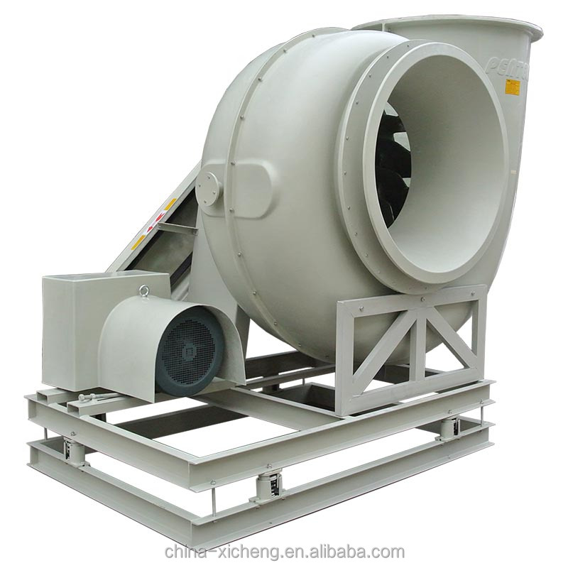FRP glass fiber reinforced plastic anticorrosive centrifugal fan is mainly composed of impeller, casing, air inlet, casing support frame, belt, pulley, pulley cover, base and relative base, shock absorber, and other parts of which are equipped with motors. FRP glass fiber reinforced plastic anticorrosive centrifugal fan has a maximum air volume of 150,000 CMH with high performance, high efficiency, low noise, low vibration, and energy-saving, which can create profits for you and is suitable for a variety of working conditions.Working principle of FRP anticorrosive centrifugal fan