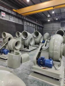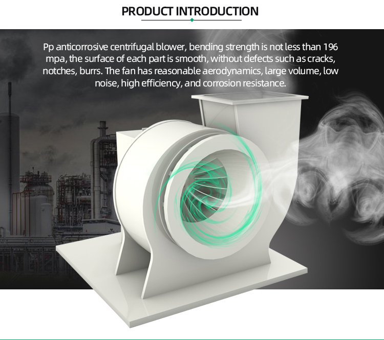 FRP/PP plastic centrifugal blower fan is made of FRP/PP material, also called an anticorrosive centrifugal fan. Generally, it can be used on occasions with corrosive gas to discharge corrosive gas. The gas conveyed is not allowed to contain viscous substances, dust, and hard particles less than or equal to 150mg/m3, gas temperature less than or equal to 60 degrees, and relative humidity less than or equal to 100%. Fiberglass centrifugal blowers are not suitable for high-temperature places.Features