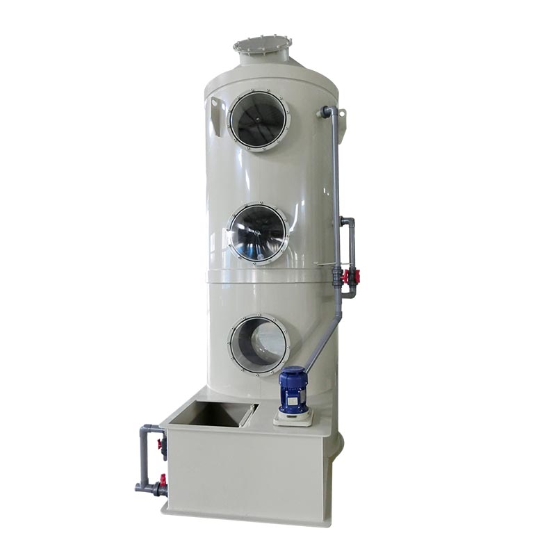 A hydrochloric acid fume scrubber is widely used in the washing and purification of NOX, SO2, H2SO4, HCl, HF, SIF4, CO2, and other toxic and harmful gases generated in the chemical, electroplating, hardware, electrical, pharmaceutical, printing, and dyeing, telecommunications, and other mechanical processing industries; It can also be applied to the deodorization treatment of ammonia, hydrogen sulfide, phenolic, formaldehyde, methanol, amines, and other malodorous substances; the purification area of acid mist exhaust gas depends on the treatment volume, and the neutralization and removal effect is 95%; the discharge port is less than 10PPM. Fans and pumps can be flexibly designed and laid out according to the user’s site, featuring convenient maintenance, compact structure, and a small footprint.