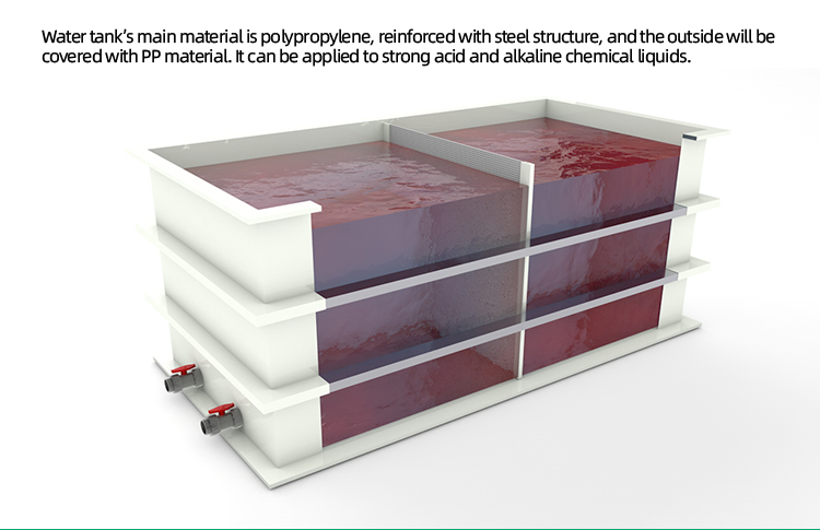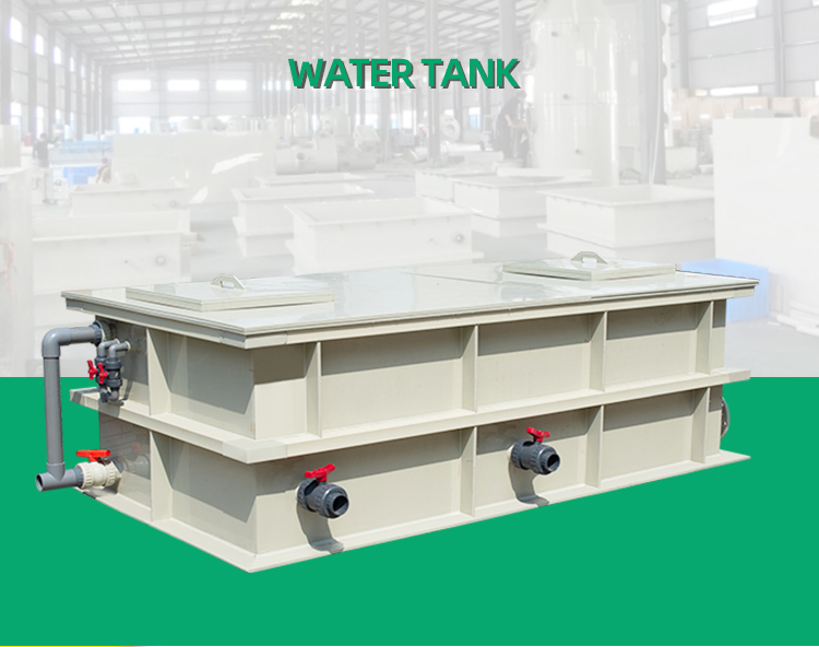PP plastic plate and steel pipe are processed, and a certain thickness of PP plate is selected to be welded and formed, and the exterior is reinforced by steel pipe welding. The PP water tank is mainly used to contain acid and alkali corrosive liquids.