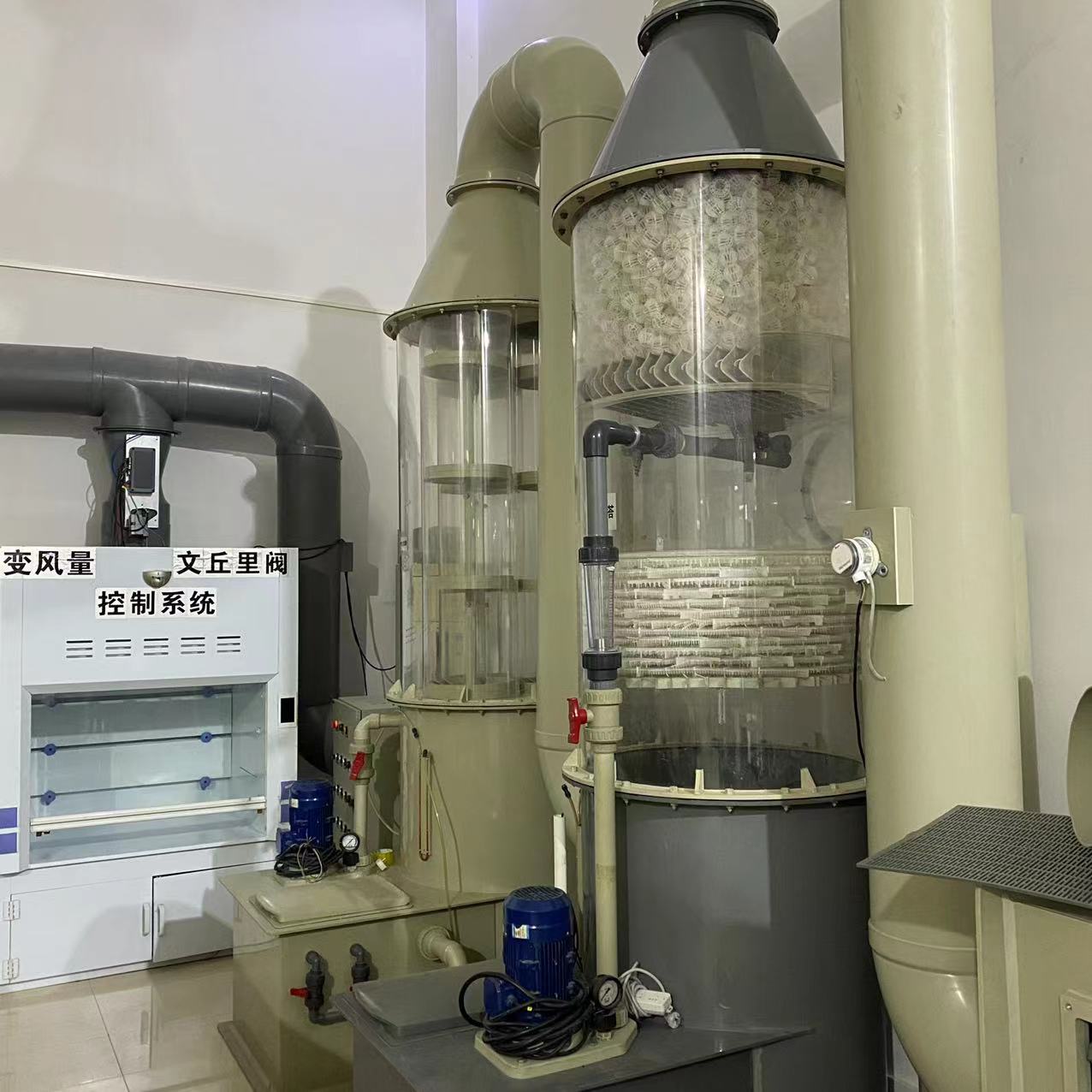The high-efficiency spray tower system and fan unit suck the collected waste gas into the acid mist scrubber, and flow through the filling layer (gas/liquid contact reaction medium), so that the waste gas is in full contact with the liquid medicine (washing liquid) flowing on the surface of the filling, In order to absorb the acidic or alkaline dirt contained in the exhaust gas. After washing, the waste liquid is collected in the sump and then discharged to the wastewater system for treatment.