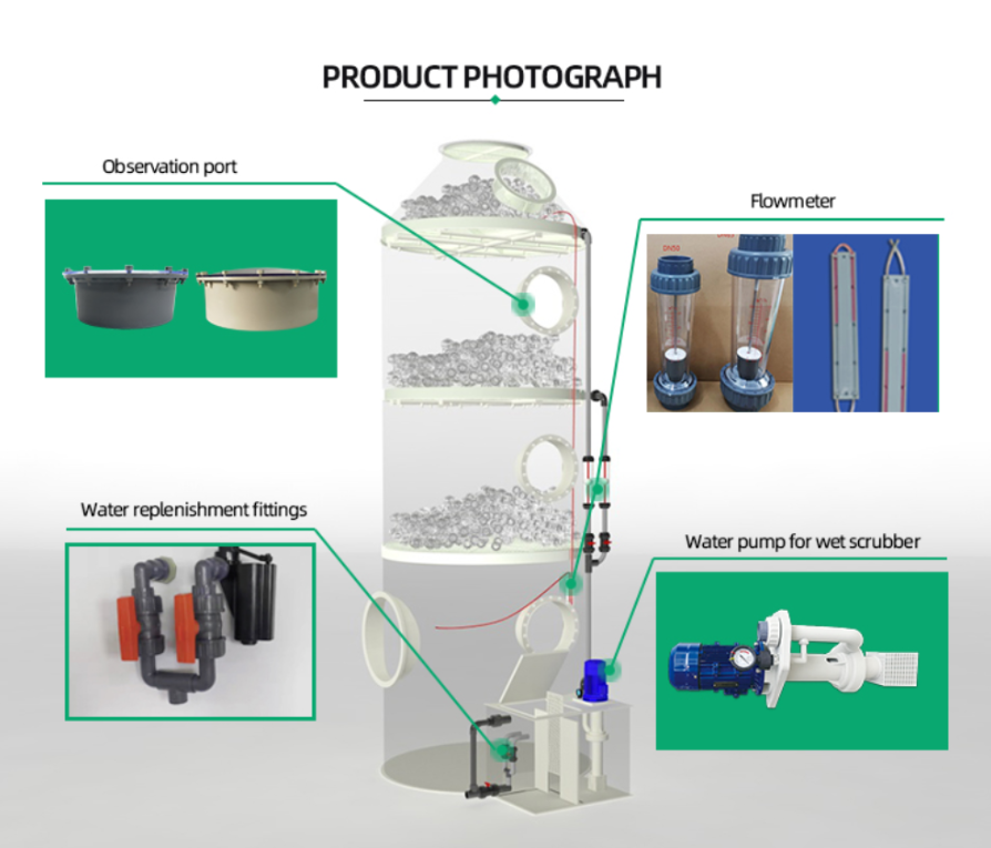 The structure of the PP gas scrubber is summarized as a defogging layer, spray layer, filler layer, transparent window, liquid storage tank, and water pump.
