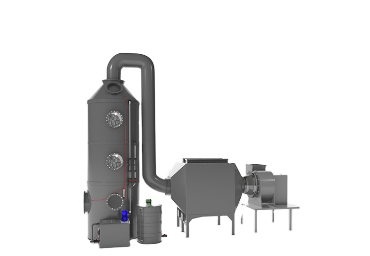 The chemical gas enters the scrubber from the bottom of the scrubber, is sent into the intake space by the blower, and then rises evenly and flows into the packing absorption section. The packing layer is filled with polyhedral balls or Raschig rings to increase the contact neps of the exhaust gas with water. The pollutants in the exhaust gas can chemically react with the water, and the chemical substances will be absorbed by the water. As the absorption liquid of the filler layer flows down to the liquid storage tank, the exhaust gas that is not fully absorbed will rise to the spray layer and will be fully reacted by the high-speed spray water droplets.